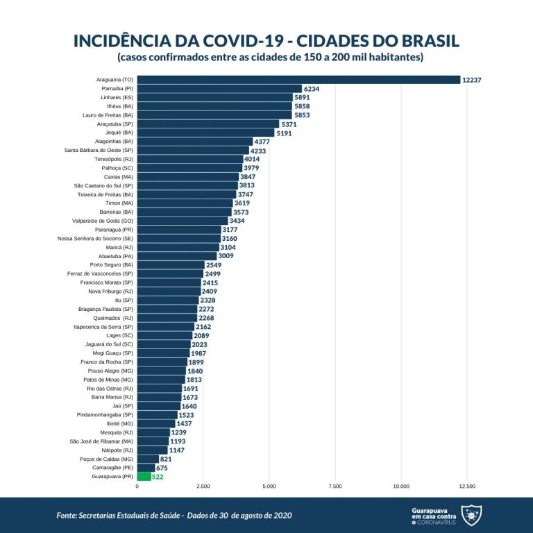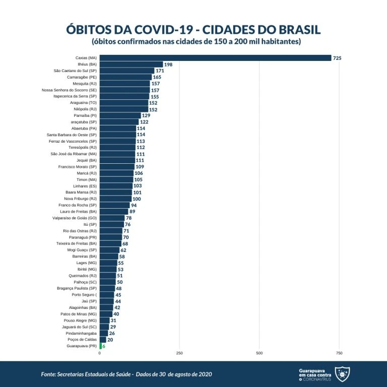 Neste recorte, são 46 cidades do Brasil, e Guarapuava está na última posição no que se refere ao número de casos confirmados, número de óbitos, índice de casos e índice de óbitos por mil habitantes. A amostra considera dados das Secretarias Estaduais de Saúde, referente ao último domingo (30).