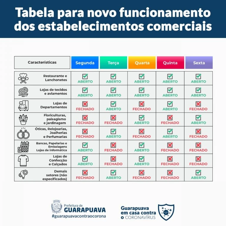 Em diálogo constante com a Comissão Médica Especializada em Orientação e Recomendação de Medidas de Enfrentamento a Pandemia do Covid-19, com respaldo técnico e análise de dados feitos por profissionais da área da saúde e vigilância epidemiológica do município, definiu-se a retomada gradual e progressiva do comércio local. Para manter o cumprimento das normativas de segurança e prevenção a pandemia, a abertura se dará de forma intercalada, conforme a seguinte escala: