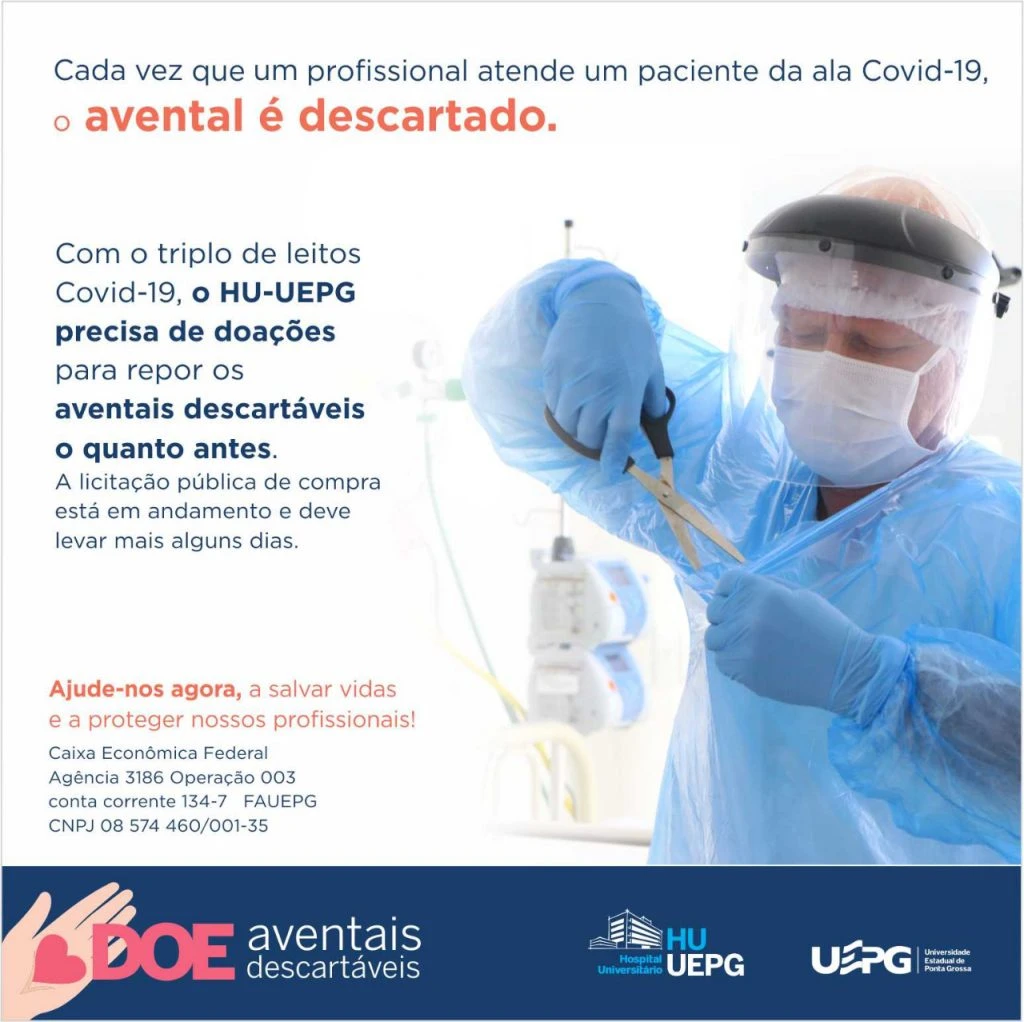 Com o número de pacientes na ala da Covid-19 crescendo quase que diariamente, o Hospital Universitário de Ponta Grossa, (HU-UEPG) informa que precisa de aventais descartáveis proteger os profissionais que estão na linha de frente do combate ao coronavírus.