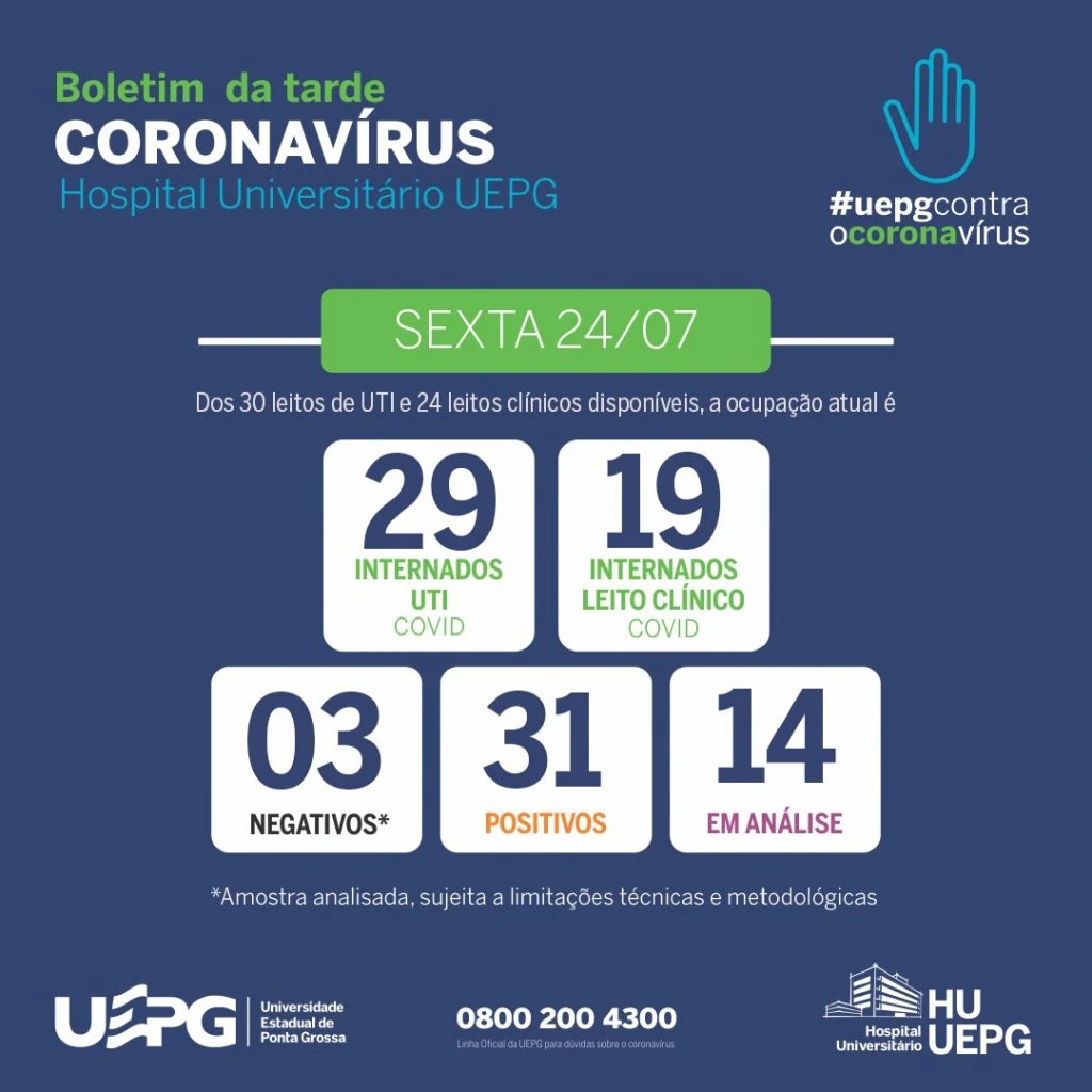 o novo boletim divulgado pelo Hospital Universitário no início da noite deste sexta-feira (24) mostra que dos 30 leitos de UTI destinados para COVID-19, 29 estão ocupados. Apenas um leito está disponível no Hospital que é referência para tratamento de pacientes com coronavírus. O documento revela que, dos 24 leitos clínicos, 19 estão ocupados.