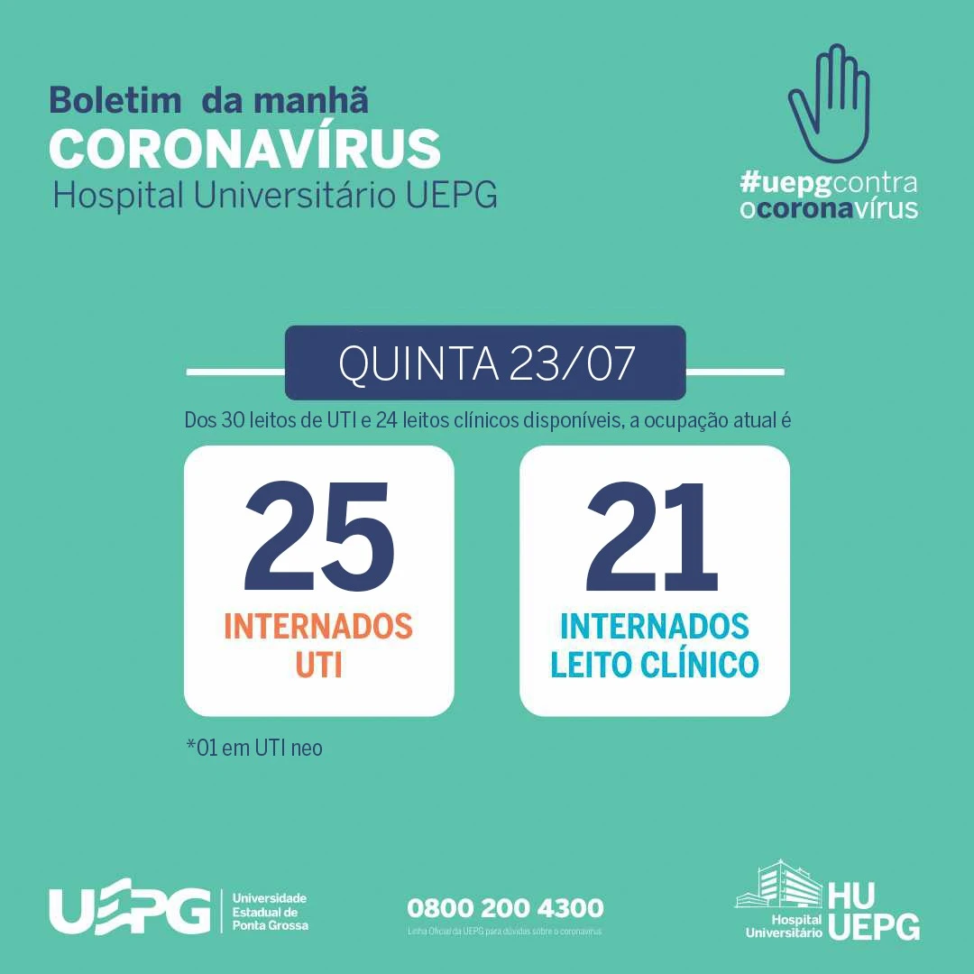 Na manhã desta quinta-feira (23), o Hospital Universitário Regional dos Campos Gerais (HU-UEPG) divulgou um boletim atualizando o número de leitos disponíveis para o tratamento da Covid-19 na instituição.