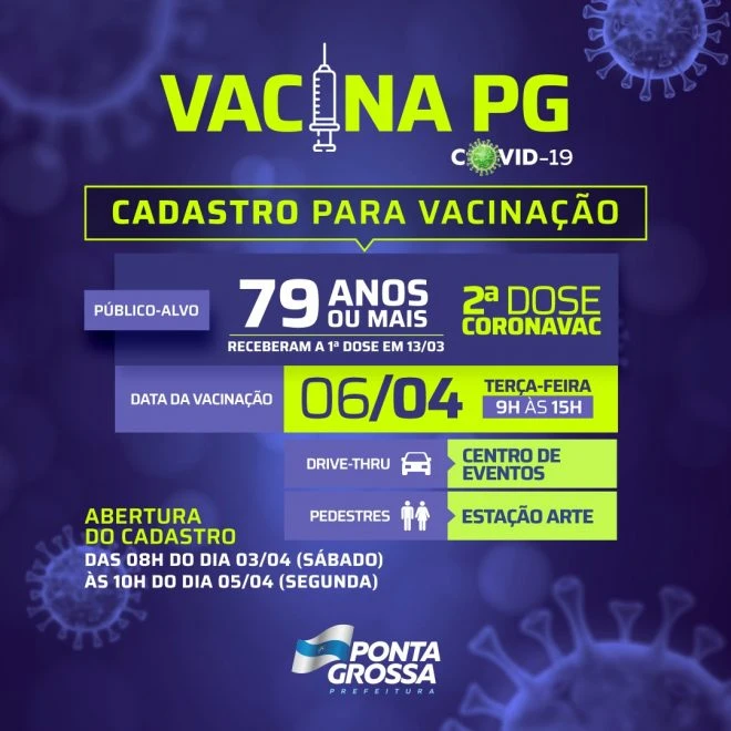 Na próxima terça-feira (6), a Prefeitura de Ponta Grossa, por meio da Fundação de Saúde (FMS), vai realizar a aplicação da 2ª dose da vacina Coronavac para o público de 79 anos ou mais que foi imunizado no dia 13 de março.