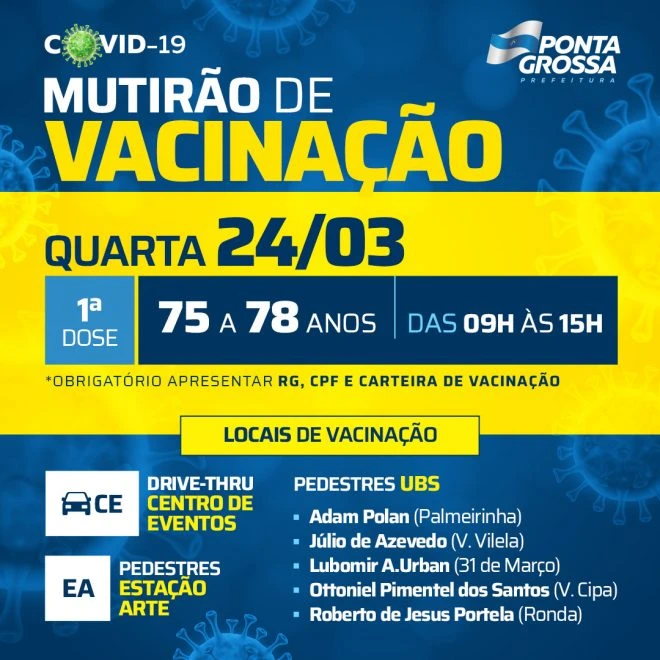 Ponta Grossa recebeu mais um lote de vacinas nesta terça-feira (23) e programou novo mutirão de vacinação nesta quarta-feira (24). O público imunizado com a aplicação da primeira dose são os idosos de 75 a 78 anos que não conseguiram se imunizar no último mutirão. A Fundação Municipal de Saúde (FMS) estará disponível das 9h às 15h aplicando as vacinas em sete estruturas distribuídas pela cidade. Para público a pé terá equipe na Estação Arte e em cinco Unidades Básicas de Saúde (UBS), a população que estiver de carro deverá procurar o Centro de Eventos, através do Drive Thru.