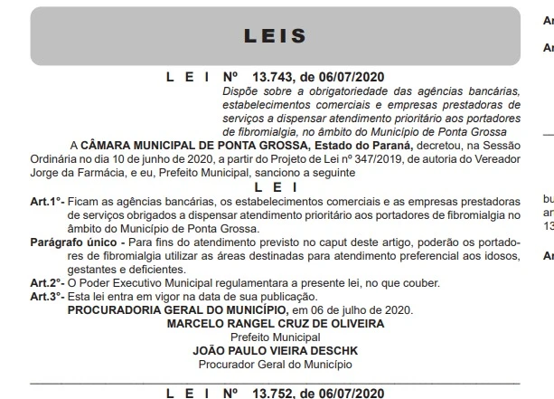 Foi sancionada e publicada em Diário Oficial desta segunda-feira (20) pelo prefeito Marcelo Rangel a lei que institui que portadores de fibromialgia tenham prioridade no atendimento em agências bancárias, no comércio e em empresas prestadoras de serviço na cidade de Ponta Grossa.