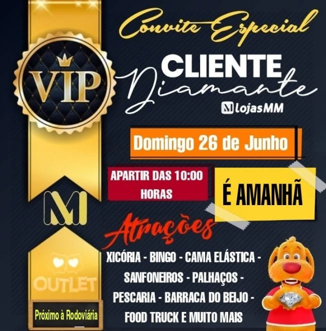 A Loja MM Matriz promove, neste domingo (26), um 'Mega Feirão' para colaboradores e clientes especiais. O evento acontecerá das 10h às 18h com diversas atrações juninas para toda a família, incluindo bingo, apresentações musicais, além de preços e condições especiais de pagamento.