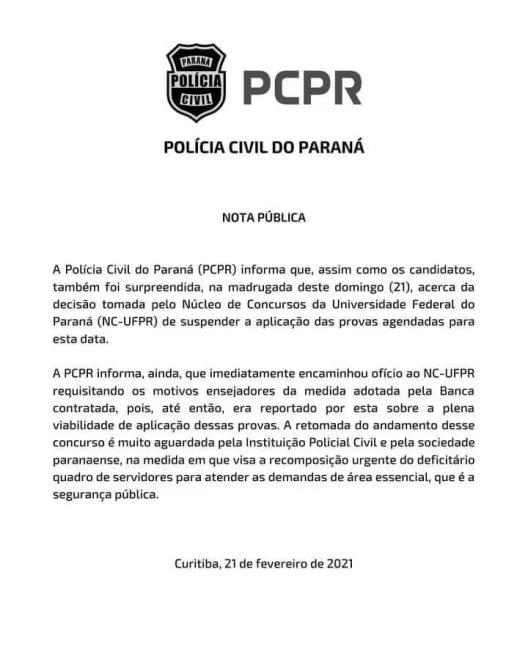 A organização do concurso público da Polícia Civil do Paraná suspendeu a realização da prova do processo, prevista para acontecer neste domingo (21). O processo seletivo prevê contratação de delegados, investigadores e papiloscopistas.