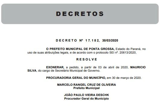 O secretário de Governo de Ponta Grossa, Maurício Silva, teve a exoneração publicada em diário oficial nesta terça-feira (31) deixando a pasta a partir do dia 03 de abril. Ele pediu para deixar a Secretaria para poder estar apto para as eleições municipais.