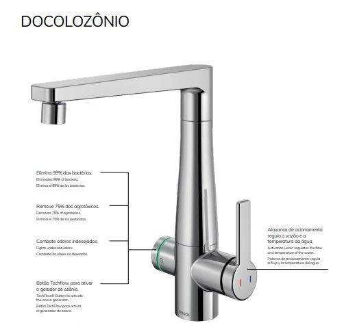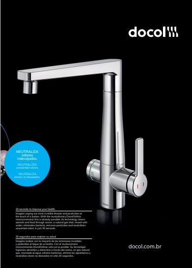 Trata-se da torneira Blink Ozônio, integrante da linha Docol e que pode ser aplicada em cozinhas e banheiros. O produto, em apenas 30 segundos, consegue eliminar bactérias e agrotóxicos - podendo acabar com 99% dos organismos presentes nos alimentos. Aliada à eficiência está o elegante design do produto. A engenheira e proprietária da Metais & Co, Juliana Girardi Neiverth, destaca que a linha Ozônio foi desenvolvida para "levar à casa das pessoas produtos tecnológicos, sustentáveis e aliados da saúde, reinventando o uso da água nos ambientes para um dia a dia mais saudável".