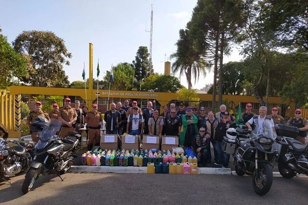 Os motociclistas foram recepcionados pelo comandante do batalhão, tenente-coronel Olavo Vianei Francischetti Nunes, juntamente com oficiais e praças que prestam serviços na sede da unidade. Ao todo, foram entregues 680 litros de produto desinfetante, 198 barras de sabão, além de quantidades de outros produtos.