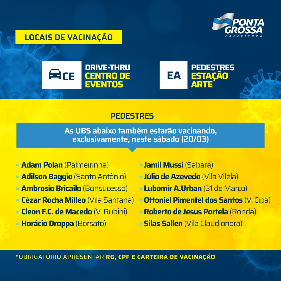 Ponta Grossa recebeu mais um lote de vacinas nesta sexta-feira (19) e programou novo mutirão de vacinação amanhã (20). Desta vez, o público imunizado com a aplicação da primeira dose são os idosos de 75 a 78 anos. A Fundação Municipal de Saúde (FMS) estará disponível das 9h às 16h aplicando as vacinas em 13 estruturas distribuídas pela cidade para público a pé, sendo uma a Estação Arte e o restante Unidades Básicas de Saúde (UBS), e no Centro de Eventos com o Drive Thru.