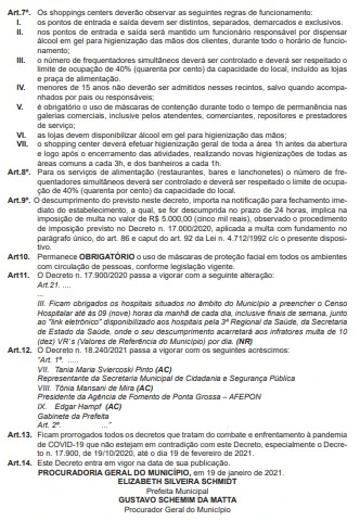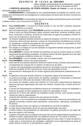 O decreto nº 18.324 publicado nesta terça-feira (19) no Diário Oficial da Prefeitura de Ponta Grossa adota novas medidas para combater o contágio do coronavírus na cidade.