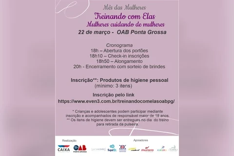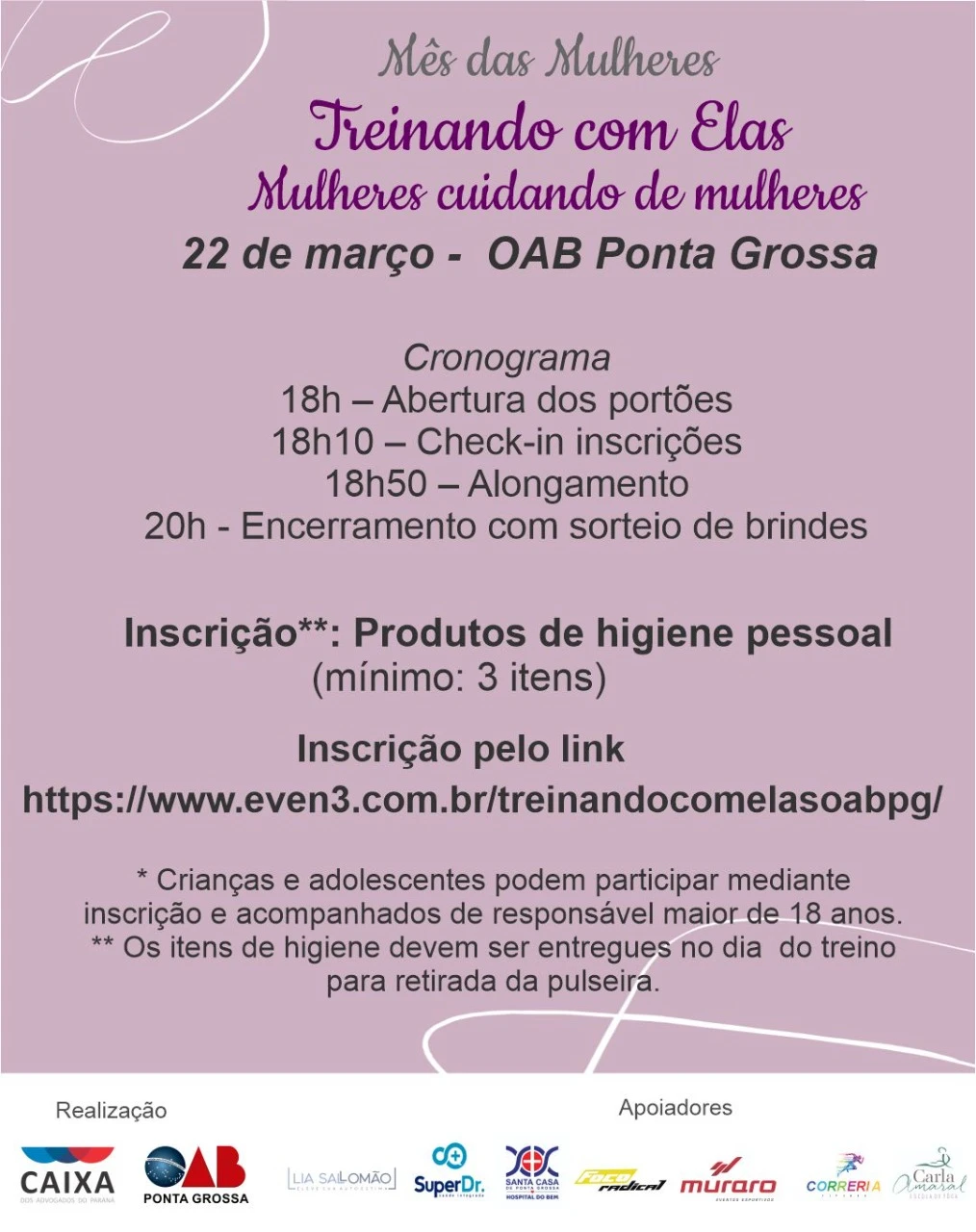 www.oabpg.org.br), na aba Agenda de Eventos. O kit de produtos de higiene pessoal poderá ser entregue no dia do evento, no momento da retirada da pulseira de participação. Haverá sorteio de brindes para as participantes. O ‘Treinando com Elas’ é aberto a toda a comunidade mediante entrega da doação. Crianças e adolescentes podem participar acompanhados de um responsável maior de 18 anos. As vagas são limitadas.