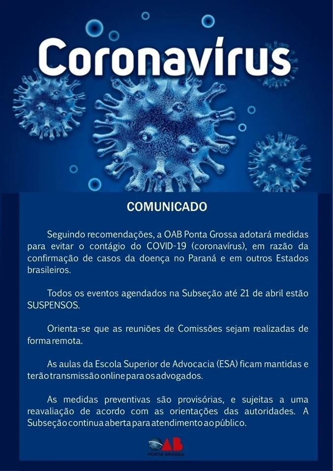 A OAB de Ponta Grossa suspendeu os eventos e cursos presenciais na até dia 21 de abril como medida de prevenção à Covid-19. A orientação é para que as reuniões das comissões sejam realizadas de forma remota. As aulas da Escola Superior de Advocacia terão transmissão on-line para os alunos.