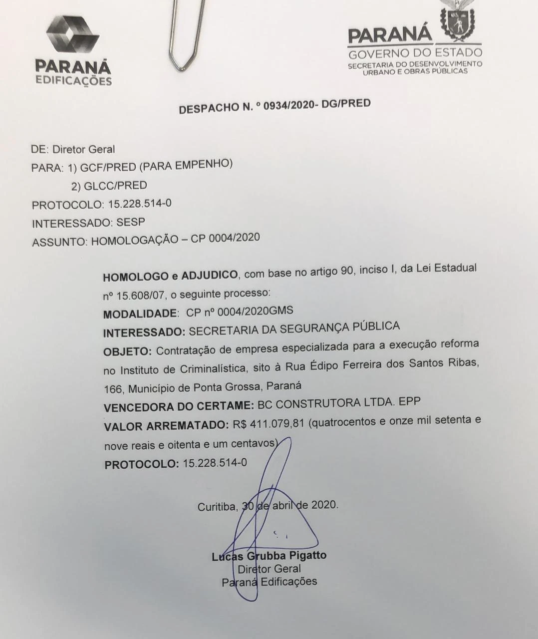 O secretário de infraestrutura e logística do estado, Sandro Alex, anunciou nesta segunda-feira (4), a publicação da contratação da empresa que fará a construção do IML (Instituto Médico Legal) de Ponta Grossa; trata-se da empresa BC Construtora. O valor da obra é de R$ 411 mil e inclui a demolição do muro, taludamento e implantação de grade e piso; além de regularização de matrículas. As obras devem iniciar em 30 dias.
