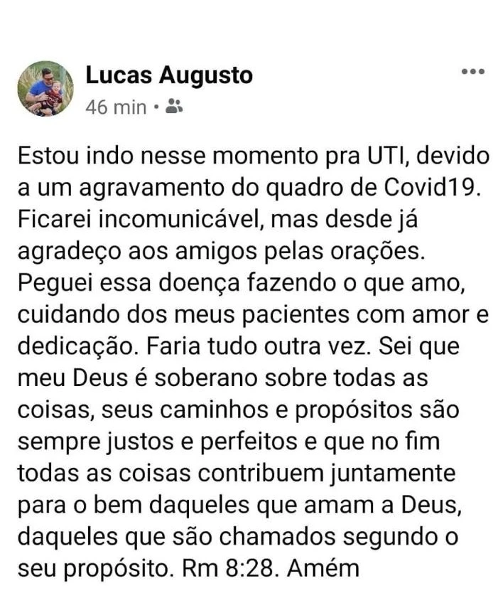 O médico Lucas Augusto, de 32 anos, morreu no último sábado (08) em decorrência do coronavírus. Internado desde o dia 25 de julho em um hospital da cidade de Maringá, Lucas escreveu um posto emocionante em sua rede social antes de ir para a UTI. "Estou indo nesse momento para a UTI, devido a um agravamento do quadro de Covid19", escreveu. O médico ainda afirmou que contraiu a doença fazendo o que amava. "Faria tudo outra vez", complementou.