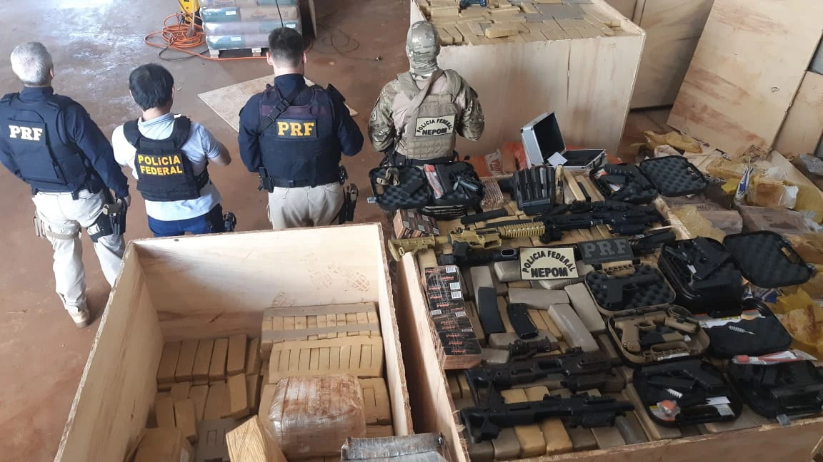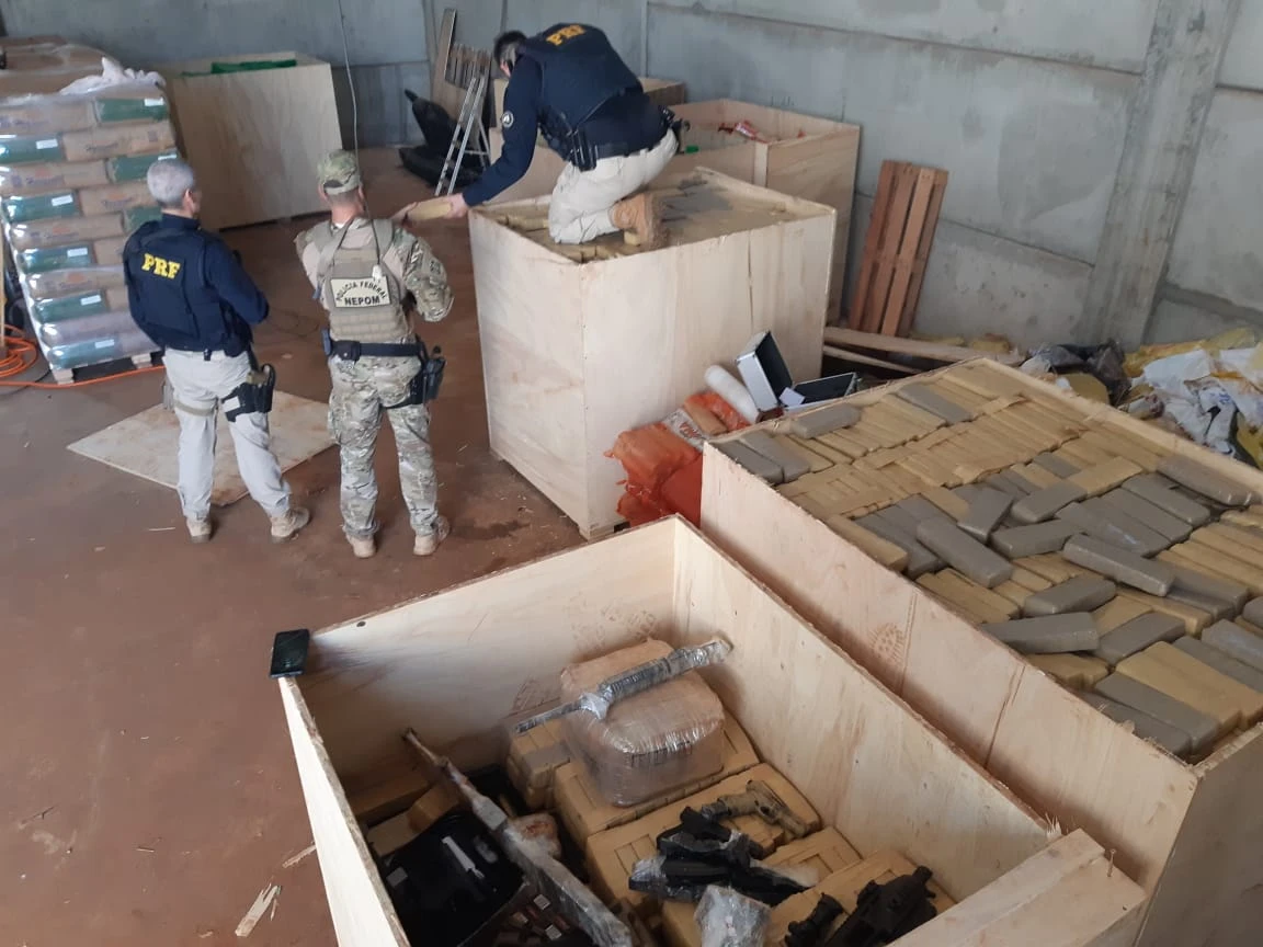 Equipes da Polícia Rodoviária Federal (PRF) e da Polícia Federal (PF) apreenderam dois fuzis, 14 pistolas, munições e toneladas de maconha acondicionadas em grandes caixas de madeira na manhã desta sexta-feira (17) em Palotina, na região oeste do Paraná.