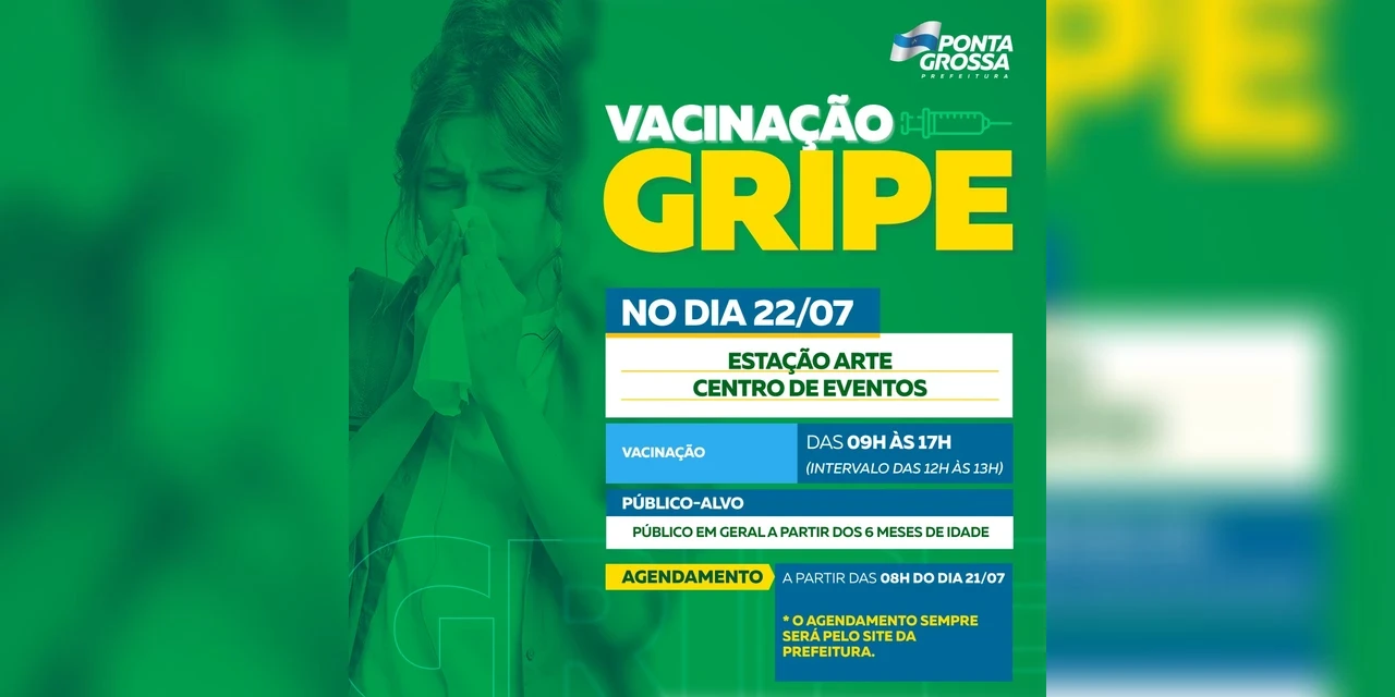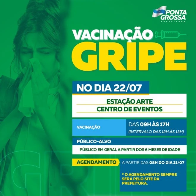 Ponta Grossa segue com a imunização da Campanha de Vacinação contra a Gripe para toda a população acima de seis meses de idade. Esta imunização continuará ocorrendo devido quantitativo de doses remanescentes. O público deve realizar o agendamento no site da Prefeitura (