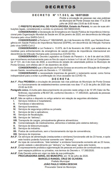 A Prefeitura de Ponta Grossa através do Diário Oficial do Município prorrogou nesta quinta-feira (16) o toque de recolher entre os dias 17 e e 23 de julho.