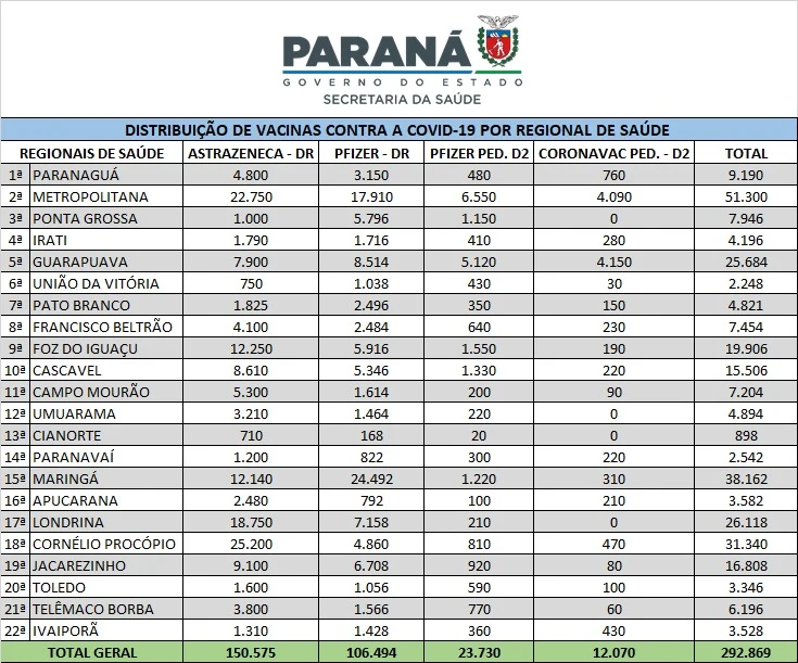 Confira a distribuição de doses enviadas nesta quarta-feira (22) por Regional de Saúde: