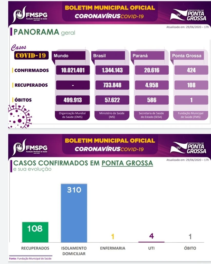 O boletim oficial divulgado pela Prefeitura Municipal de Ponta Grossa atualizou os dados de coronavírus no município. Segundo o documento foram 18 novos casos confirmados em 24h, chegando a 424 infectados na cidade. Destes, 108 estão curados, 310 em isolamento domiciliar, um paciente na enfermaria e quatro na UTI.
