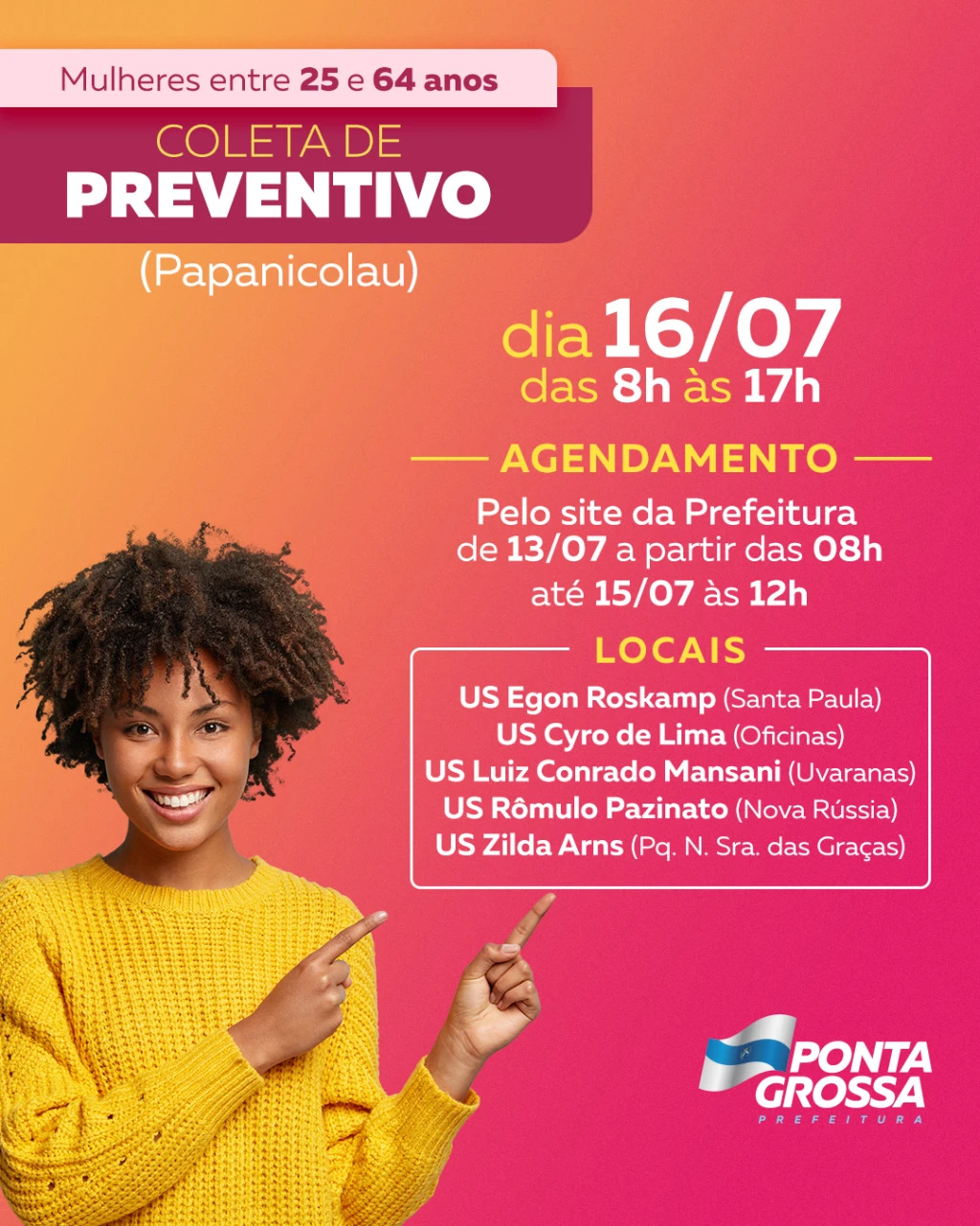 A Prefeitura de Ponta Grossa promove, neste sábado (16), um mutirão de coleta de exames preventivos (Papanicolau) direcionado a mulheres com idade entre 25 e 64 anos.