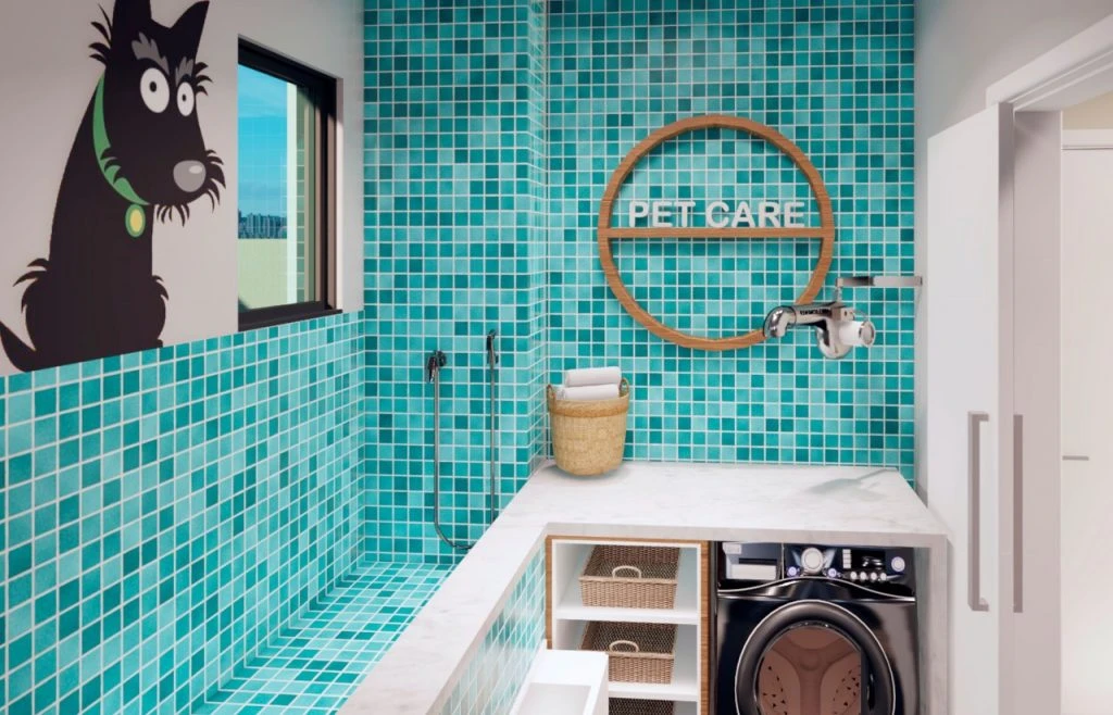 Segundo o diretor da LAAR, Junior Lara, a ideia de um edifício pet friendly surgiu da necessidade pessoal. “Assim como eu, muitos donos de pets encontram certas dificuldades físicas no convívio com os animaizinhos em prédios, onde normas de condomínio limitam a circulação deles. Esses espaços não pensam nos pets”, diz. Dessa visão, nasceu o projeto do Gran Amistad, desenvolvido pela arquiteta Liliane Abreu, “mãe” da Mimosa, a vira-lata adotada pela família. “Nós ousamos nesse projeto e o resultado foi muito bom”, diz Liliane, que teve toda a liberdade para a criação.