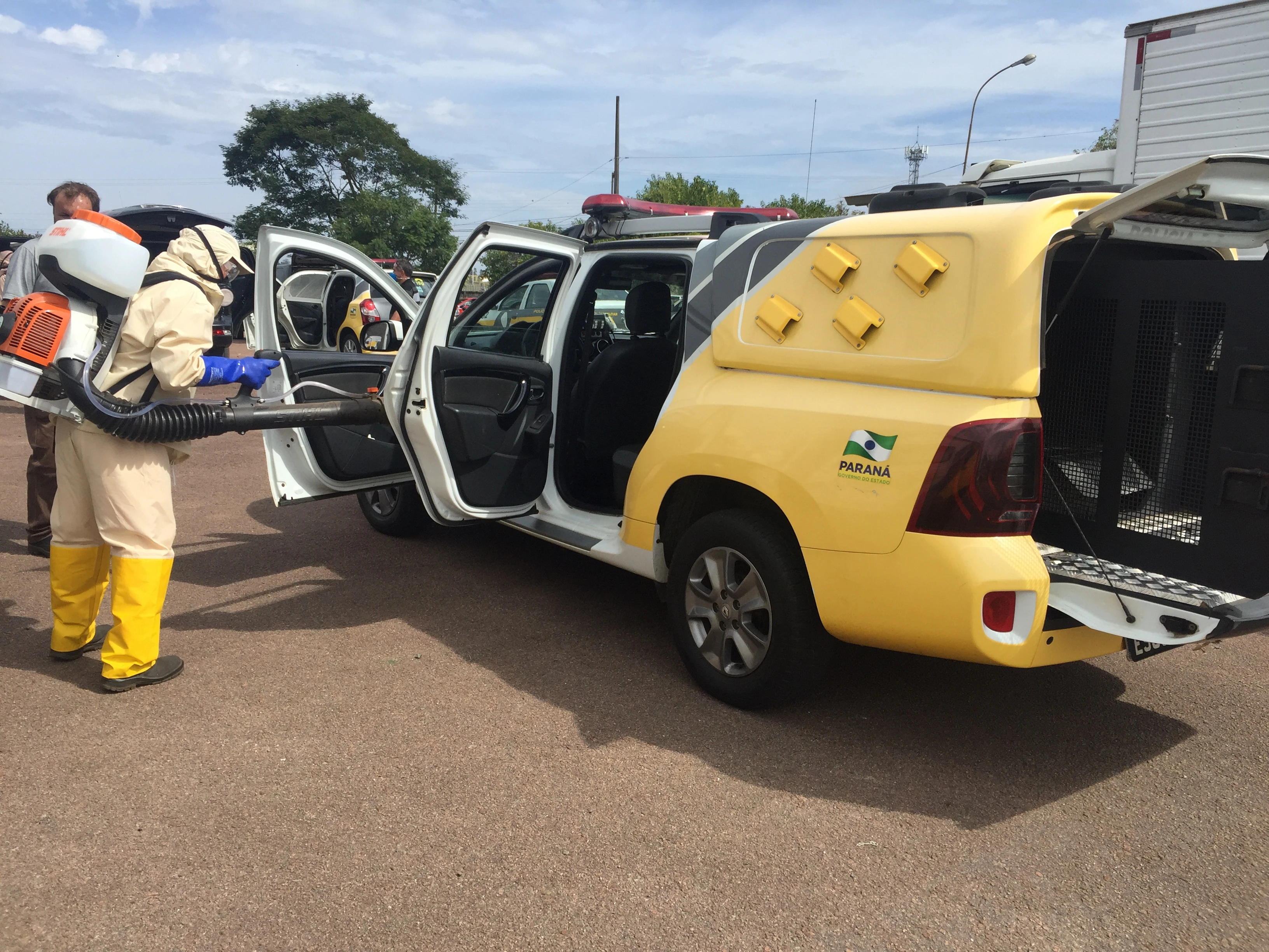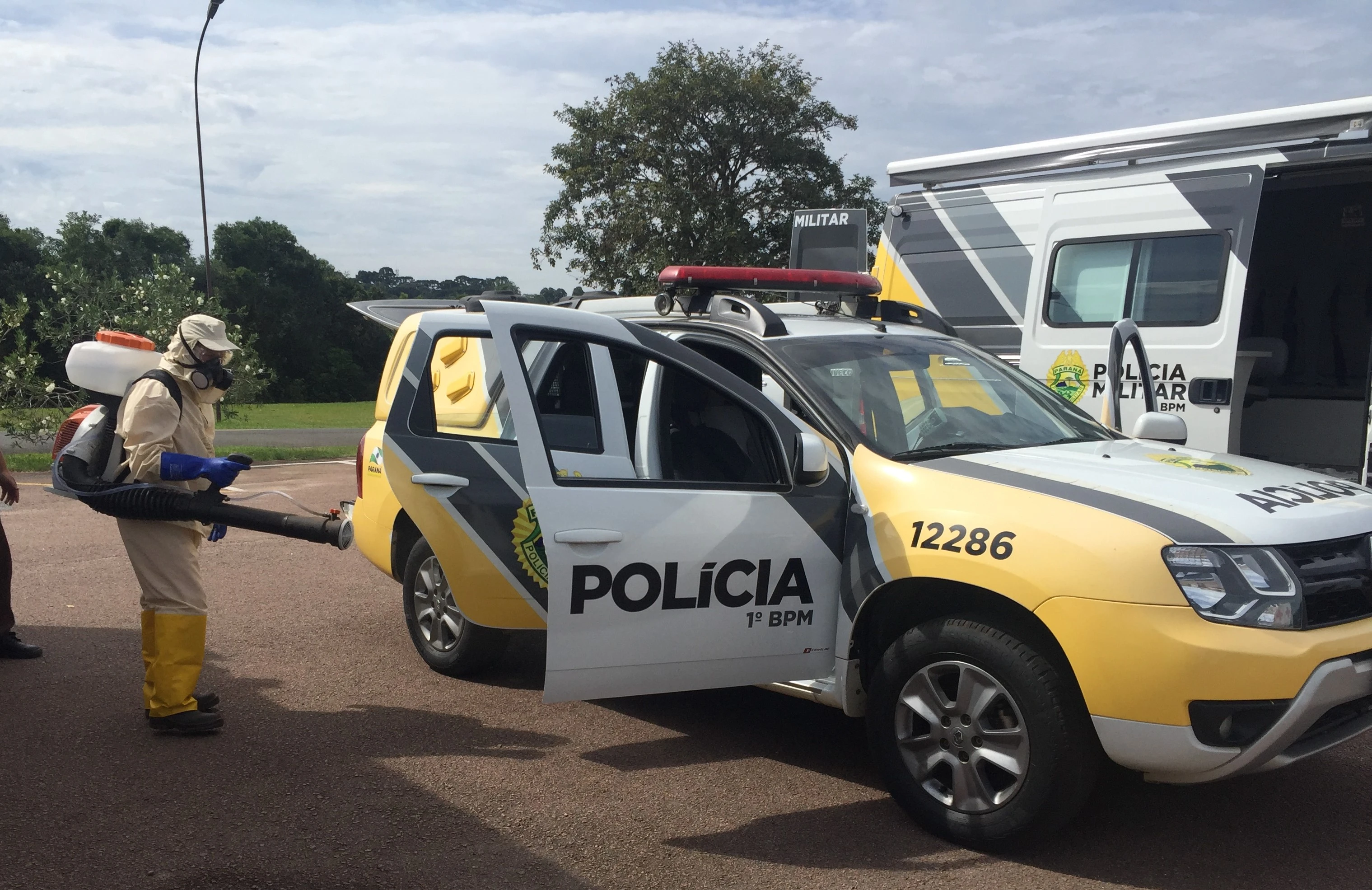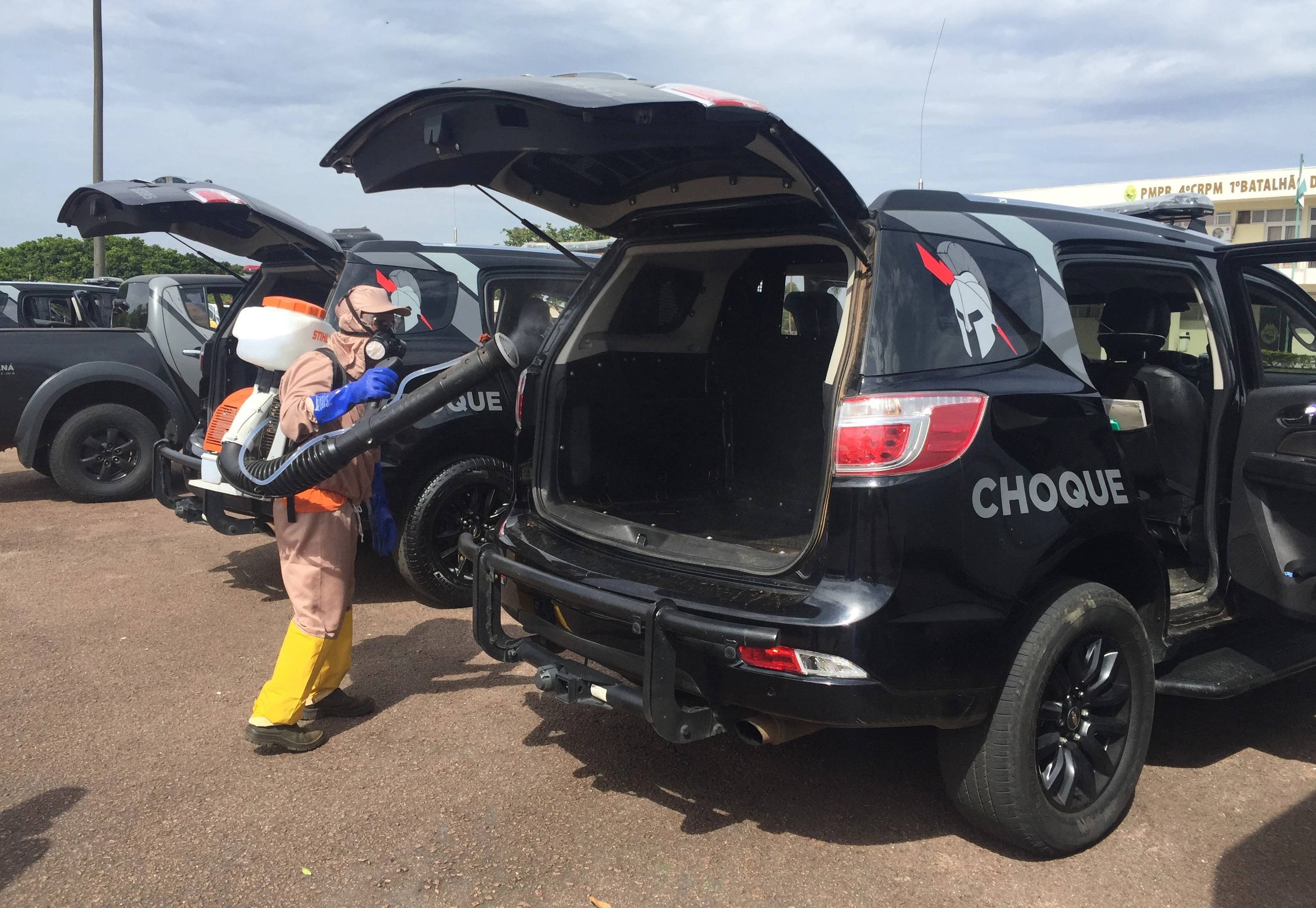 Na manhã desta quinta-feira, 2, em parceria com a Secretaria Municipal de Meio Ambiente, viaturas da Polícia Militar passaram por um processo de desinfecção.