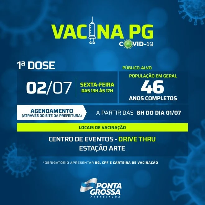 A Prefeitura de Ponta Grossa, através da Fundação Municipal de Saúde (FMS), dará continuidade na vacinação contra a covid-19 da faixa etária de 46 anos completos. A vacinação acontece na sexta-feira (2), das 13h às 17h, no Drive Thru do Centro de Eventos e na Estação Arte.