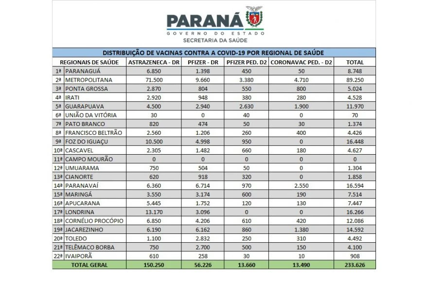 A Secretaria de Estado da Saúde (Sesa) distribuiu mais 233.626 vacinas contra a Covid-19 nesta terça-feira (14). Os imunizantes estavam no Centro de Medicamentos do Paraná (Cemepar) e foram descentralizados para as 22 Regionais de Saúde do Estado. Ponta Grossa foi contemplada com 5.024 doses, tendo amostras da AstraZeneca, Pfizer e CoronaVac.