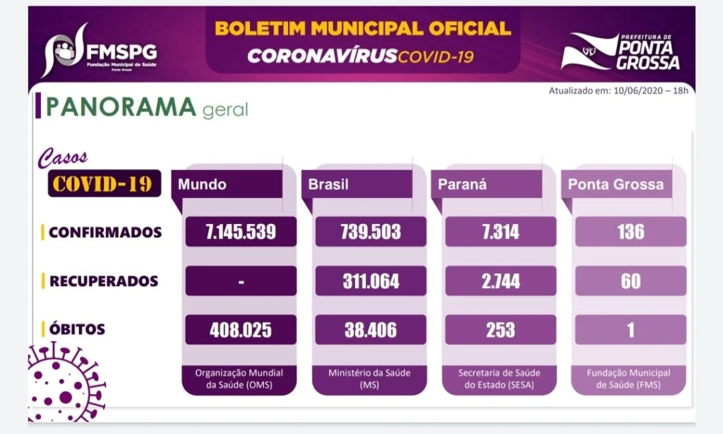 O Boletim divulgado pela Prefeitura de Ponta Grossa apresenta a atualização do avanço do novo coronavírus na cidade. Os dados foram enviados à imprensa às 18h desta quarta-feira (10). Ao todo, são 15 novos casos em 24 horas, somando 136 infectados no município. Um óbito registrado e 60 casos recuperados. A expectativa é que o prefeito Marcelo Rangel faça um pronunciamento durante o feriado para trazer novas orientações à população após a primeira morte pela doença ter sido registrada na cidade. Veja o boletim.