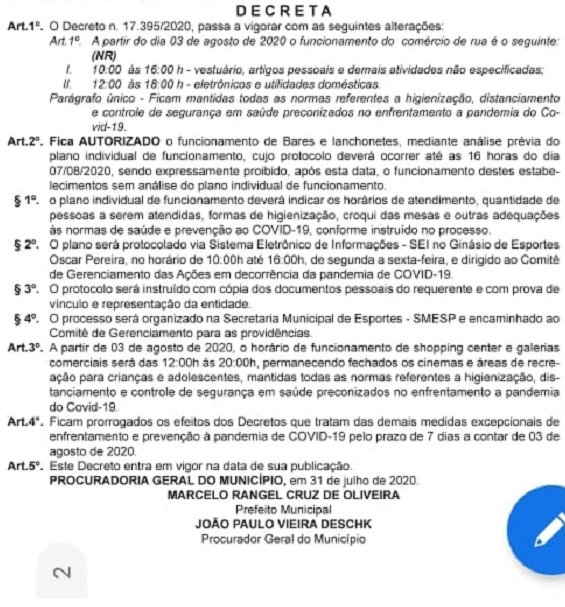A Prefeitura de Ponta Grossa, através do Diário Oficial do Município da última sexta-feira (31), decretou a volta dos atendimentos no comércio de rua no horário escalonado, de segunda-feira a sábado. Outro ponto que chamou atenção no decreto foi a autorização do funcionamento de bares e lanchonetes mediante análise prévia do plano individual de funcionamento. O prazo para bares e lanchonetes da cidade protocolarem esse plano de funcionamento encerra nesta sexta-feira (7) às 16h.