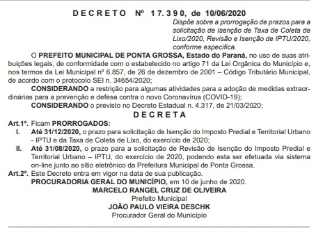 Na tarde desta terça-feira (16), o Diário Oficial do Município de Ponta Grossa trouxe, através do Decreto 17.390, a prorrogação de prazos para a solicitação de isenção da taxa de coleta de lixo 2020 e também a isenção e revisão do IPTU 2020.