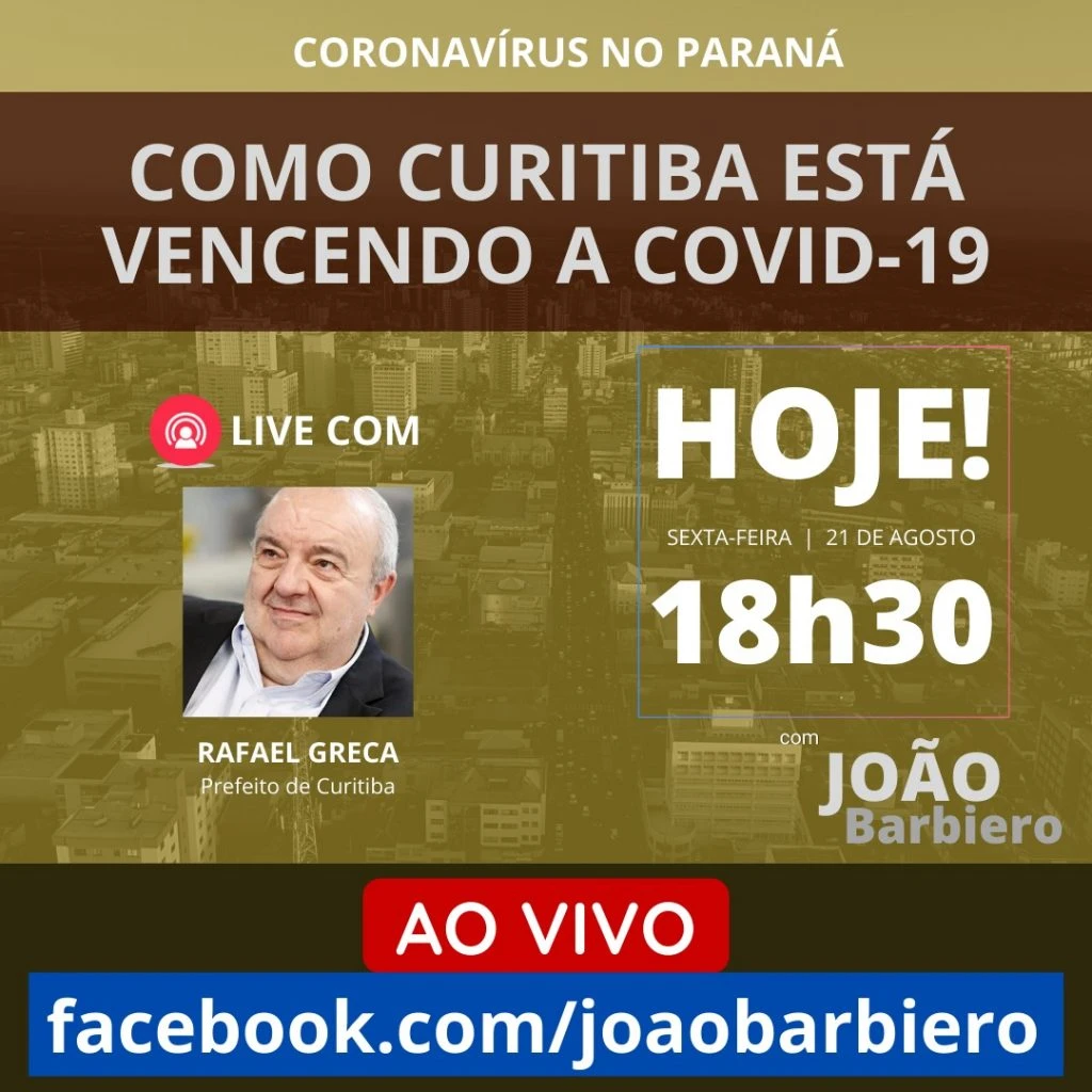 Na conversa serão abordados temas como o combate ao vírus, medidas tomadas por Greca na capital paranaense e como estão os últimos dados da doença no município. A entrevista poderá ser acompanhada no Facebook do comunicador, através do link a seguir: https://www.facebook.com/joaobarbiero.