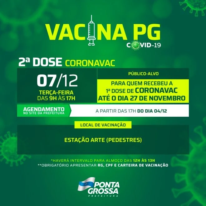 A Fundação Municipal de Saúde (FMS), através do Departamento de Imunização e da Atenção Primária, preparou uma nova etapa de imunização contra a covid-19. Na próxima terça, dia 07 de dezembro, haverá aplicação de vacina em etapa para 2ª dose de Coronavac para todos que tomaram a primeira dose no dia 27 de novembro ou em dia anterior a esta data. Os agendamentos estão abertos no site da Prefeitura. Serão disponibilizadas 1.500 doses.