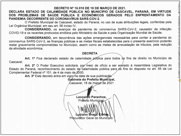 Com o fato, o Poder Executivo solicitará à Assembleia Legislativa do Paraná o reconhecimento de Estado de Calamidade Pública para os fins do disposto no Artigo 65 da Lei Complementar Federal, número 101, de 4 de maio de 2000.