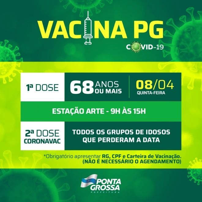 Nesta quinta-feira (8) a Prefeitura Municipal de Ponta Grossa, por meio da Fundação de Saúde (FMS), continuará aplicando vacinas nos idosos. A imunização acontecerá das 9h às 15h, na Estação Arte.