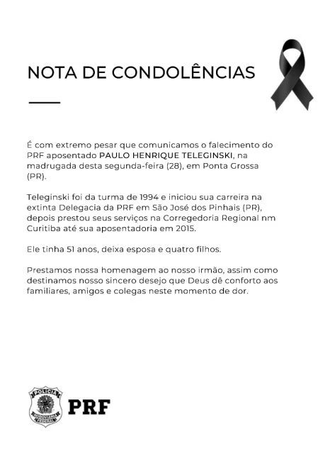 Teleginski ingressou na PRF na turma de 1994, iniciou a carreira na extinta Delegacia de São José dos Pinhais e atuou na Corregedoria Regional em Curitiba até 2015, ano em que se aposentou, segundo a PRF. "Prestamos nossa homenagem ao nosso irmão, assim como destinamos nosso sincero desejo que Deus dê conforto aos familiares, amigos e colegas neste momento de dor", diz a PRF em nota.