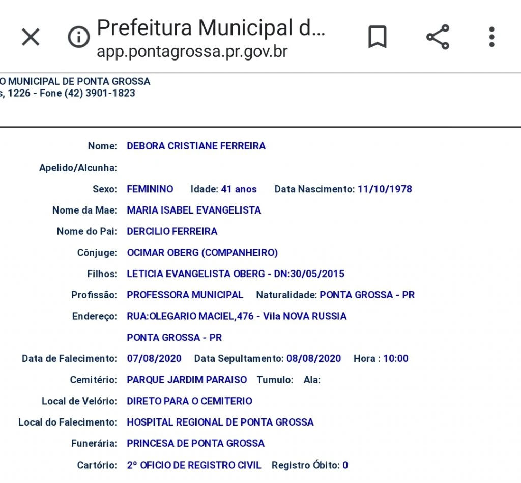 A professora Débora Cristiane Ferreira, do CMEI Odette Brauner, em Ponta Grossa, se tornou mais uma vítima fatal do coronavírus no município. Ela precisou ser internada no Hospital Universitário com falta de ar severa. A profissional da Educação não resistiu às complicações causadas pela COVID-19 e morreu nesta sexta-feira (07). O corpo foi levado direto para o Cemitério Parque Jardim Paraíso.