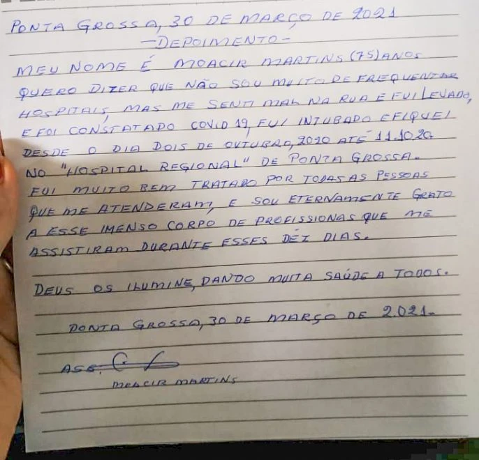Gratidão e torcida por dias melhores são unanimidade entre as mensagens, como a de Agripina Ferreira: “agradeço a todos que cuidaram de mim durante os 10 dias que fiquei aos seus cuidados. Agradeço e peço a Deus que os abençoe, pois acredito que vocês são anjos que Deus coloca aqui para nos cuidar”. Ana Dirce rememora o que passou durante o tempo em que esteve doente: “agradeço a todos vocês que ajudaram a salvar minha vida, pois sei que sou milagre por ter vencido a Covid, mesmo sendo paciente de DPOC [Doença Pulmonar Obstrutiva Crônica]”. Já Rosemeri Romanhuk não descarta a fé durante o agradecimento: “esse vírus está assustando a todos, mas Deus tem levantado verdadeiros anjos em forma de médicos, enfermeiros, técnicos, não esquecendo os demais valentes que atuam nas outras áreas, o que permite o bom atendimento”.