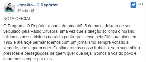 O Programa O Repórter a partir de amanhã, 5 de maio, deixará de ser veiculado pela Rádio Difusora, uma vez que a direção solicitou o horário. Iniciamos nossa história no rádio ponta-grossense pela Difusora ainda em 1992 e até hoje permanecemos com um jornalismo sempre voltado a verdade, doe a quem doer. Continuaremos nosso trabalho, sem sucumbir a pressões e perseguições de quem quer que seja. Somos a voz do povo e lutaremos sempre por eles.