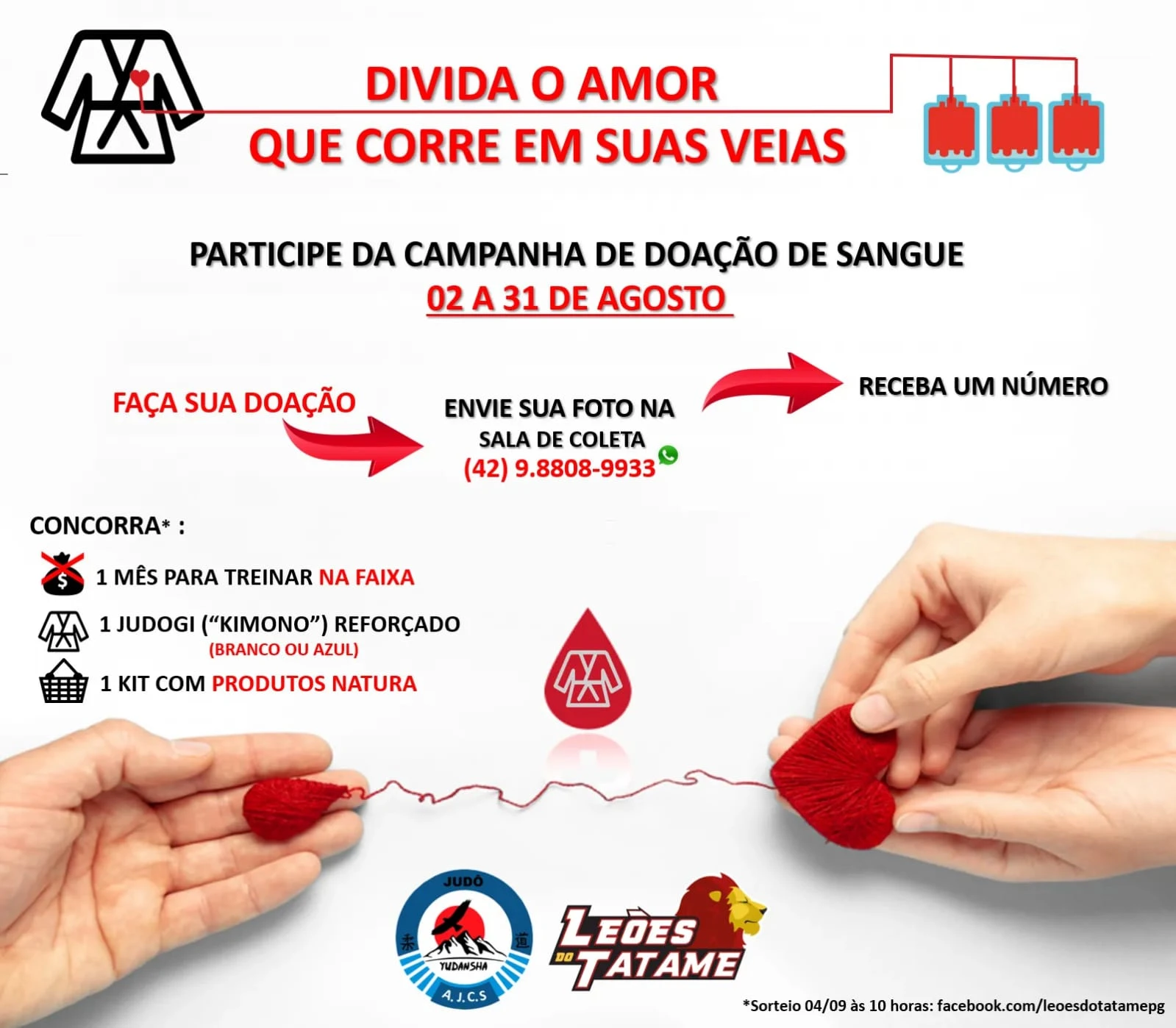 A campanha acontece de 2 a 31 de agosto. Para concorrer ao sorteio é preciso enviar uma foto durante a doação, na sala de coleta, para o número (42) 98808-9933. Após isso o doador recebe um número para participar do concurso. Serão três sorteados e a premiação consiste em um mês de treinamento gratuito na academia, um judogi (kimono) e também um kit com produtos Natura.