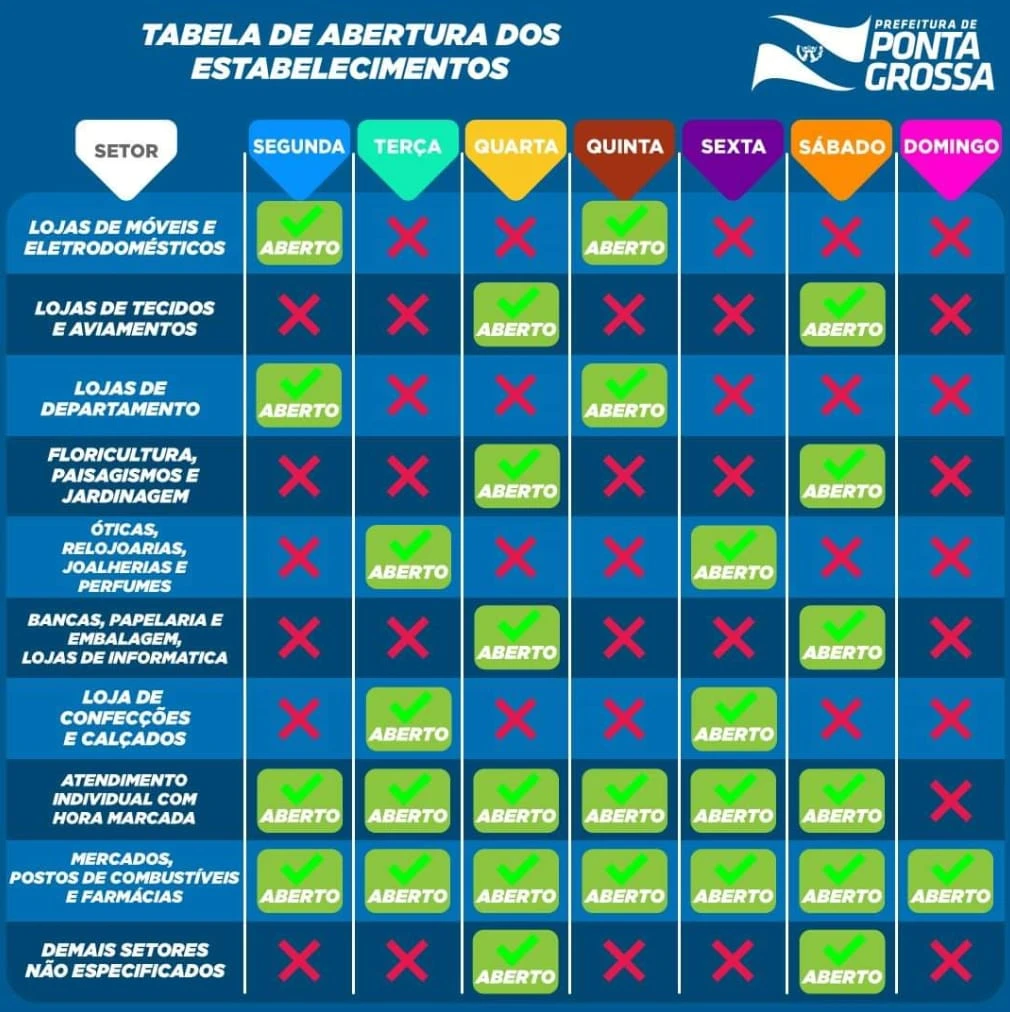 Saiba os dias de funcionamentos de acordo com os ramos de atividades na tabela abaixo.