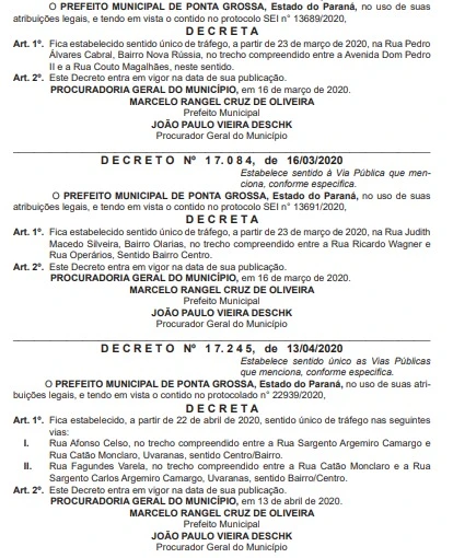 Nesta quinta-feira (16), através do Diário Oficial do Município de Ponta Grossa; foram decretadas alterações de sentido de via em quatro ruas da cidade; tais alterações no trânsito ponta-grossense entram em vigor a partir de hoje (16).