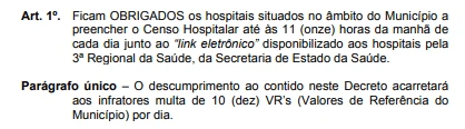 O Diário Oficial complementar também traz o Decreto 17.291/2020 que obriga os hospitais a informarem a Prefeitura sobre a situação dos leitos de internamento e de UTI.