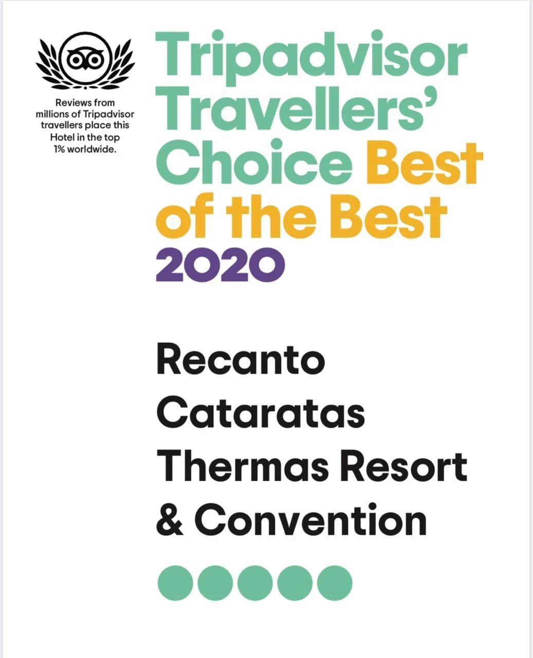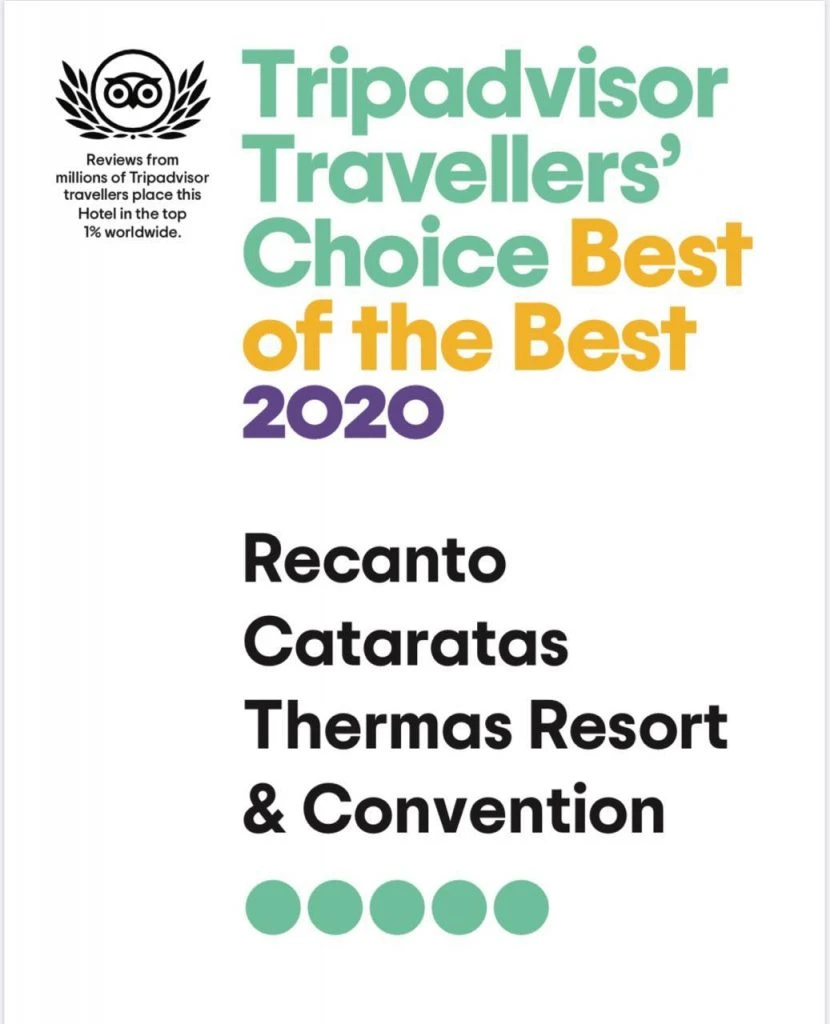 O Recanto Cataratas Thermas Resort & Convention de Foz do Iguaçu, Paraná, foi agraciado com o prêmio Best of the Best do Traveller's Choice. A premiação é oferecida pelo site de viagens Tripadvisor, sendo a mais alta homenagem concedida pelo site especialista em viagens. A premiação se baseia em milhões de avaliações e opiniões de viajantes de todo o mundo feitas no site. Esse reconhecimento é concedido anualmente e reflete o 'melhor dos melhores' em serviço, qualidade, satisfação do cliente e experiências.