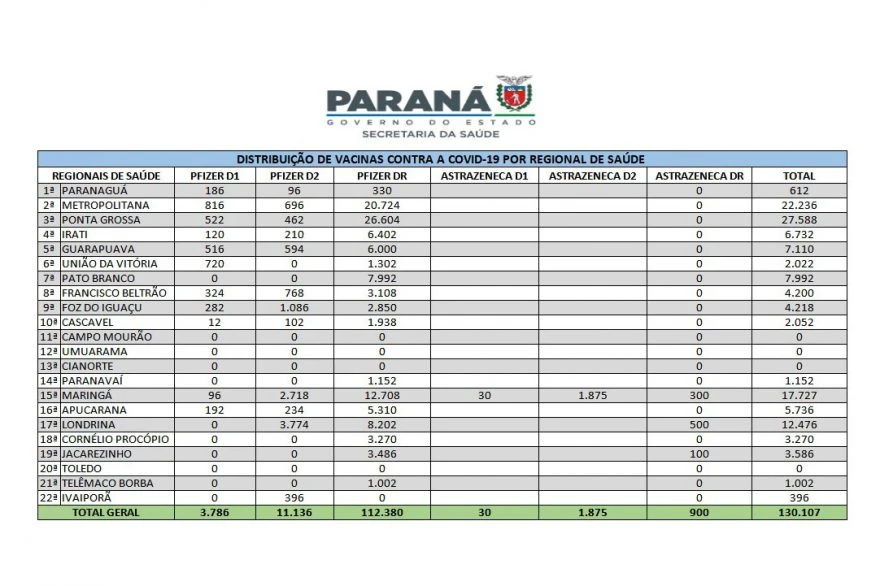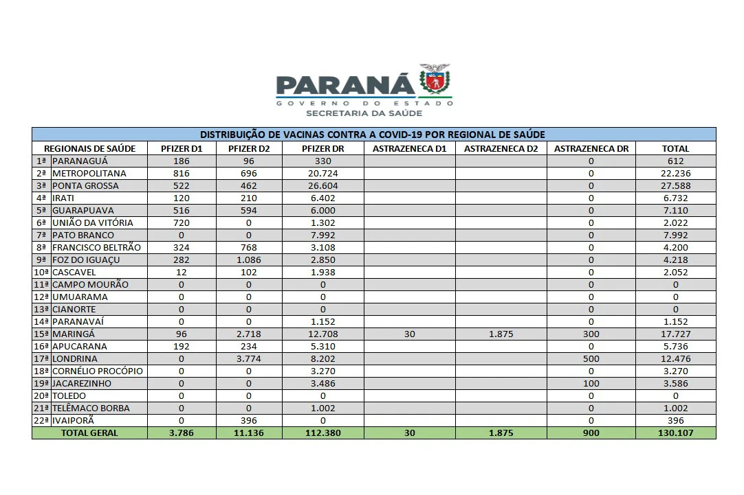 A Secretaria de Estado da Saúde (Sesa) distribuiu, via terrestre, mais 130.107 vacinas contra a Covid-19 nesta quarta-feira (12). Os imunizantes são destinados à primeira dose (D1), segunda dose (D2) e dose de reforço (DR) e foram retirados do Centro de Medicamentos do Paraná (Cemepar) pelas Regionais de Saúde.