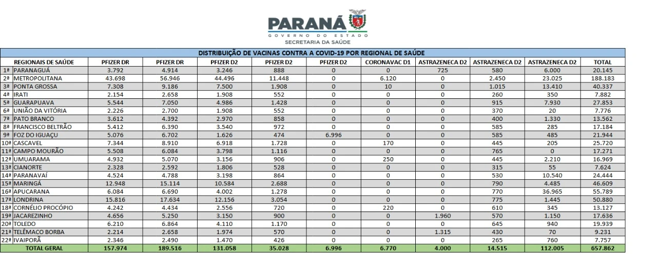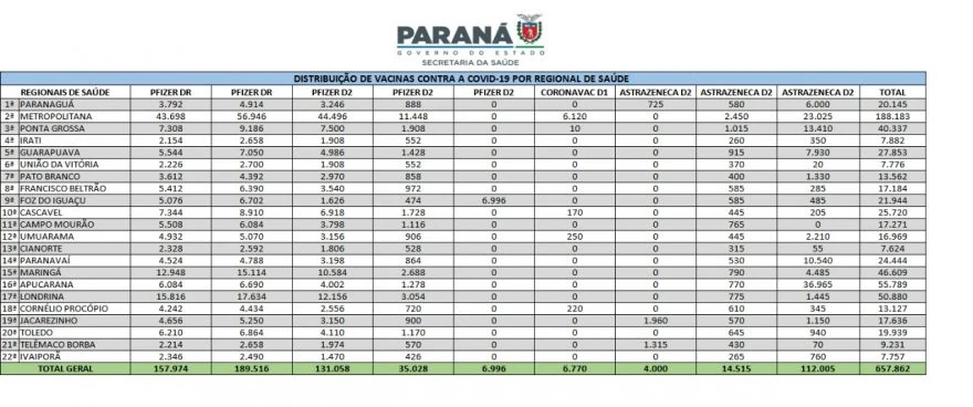 Confira a distribuição de doses enviadas neste sábado (23) por Regional de Saúde: