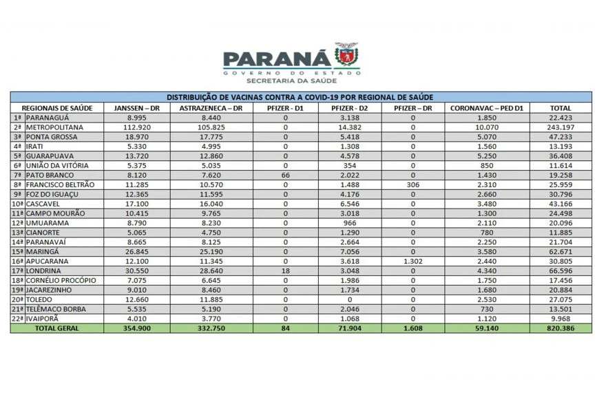 A Secretaria de Estado da Saúde (Sesa) distribuiu, nesta terça-feira (15), 820.386 imunizantes contra a Covid-19 para as 22 Regionais de Saúde no Paraná. A remessa contempla vacinas da Pfizer, Janssen, AstraZeneca e CoronaVac pediátrica.