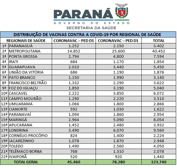 Confira a distribuição de doses enviadas nesta terça-feira (22) por Regional de Saúde: