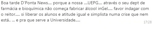 Na tarde desta terça-feira (17), um internauta do portal D'Ponta News, indagou por meio de um grupo de WhatsApp se a Universidade Estadual de Ponta Grossa (UEPG) não deveria fabricar álcool em gel e distribuir o mesmo como forma de prevenção nessa época de epidemia do Novo Coronavírus.